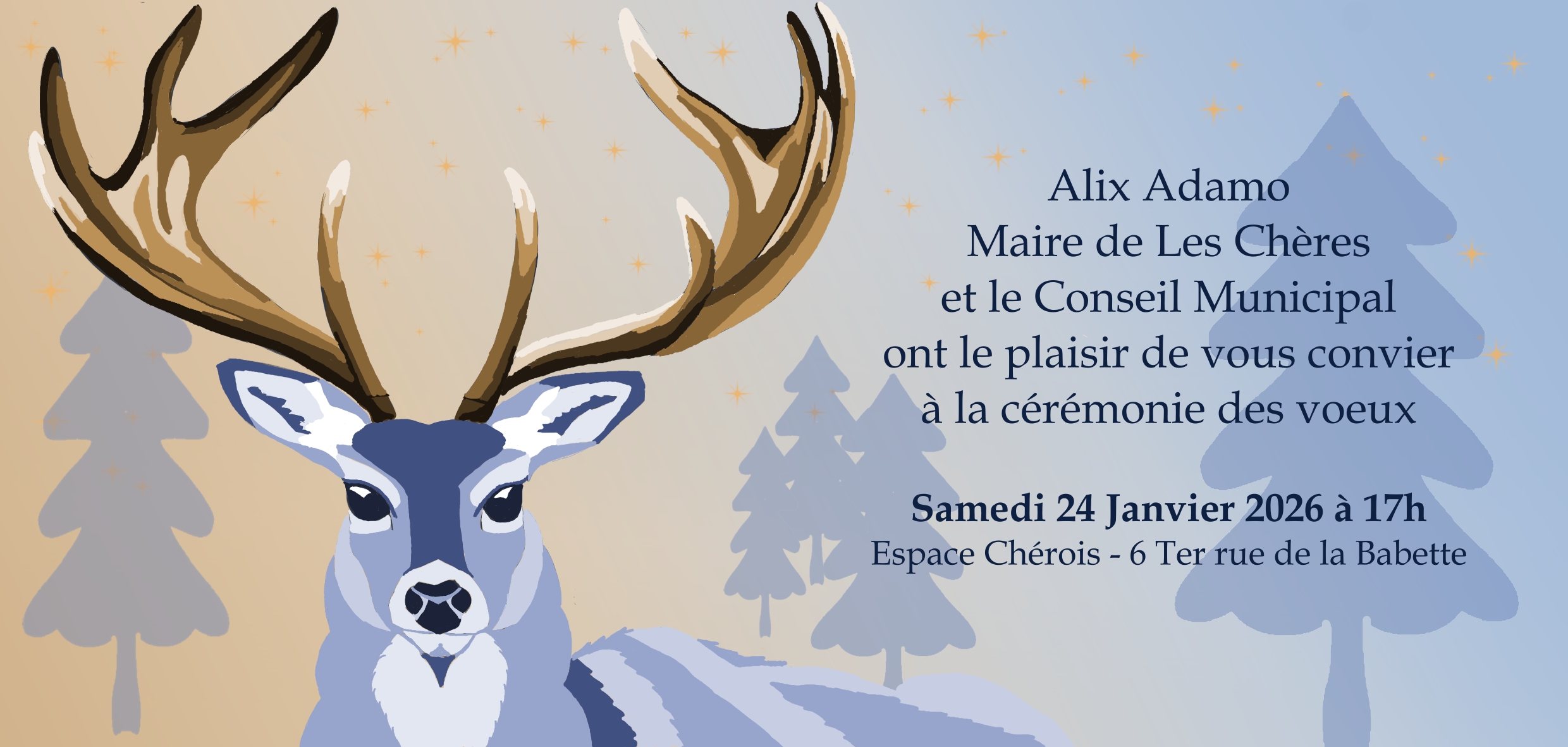 CEREMONIE DES VOEUX 2026 LES CHERES 24 JANVIER 2026 + Ajouter à mon Agenda Google + iCal / Outlook export 00 jours 00 heures 00 minutes 00 secondes Date Jan 24 2026 Heure 5:00 pm Partagez cet événement RechercherRechercher